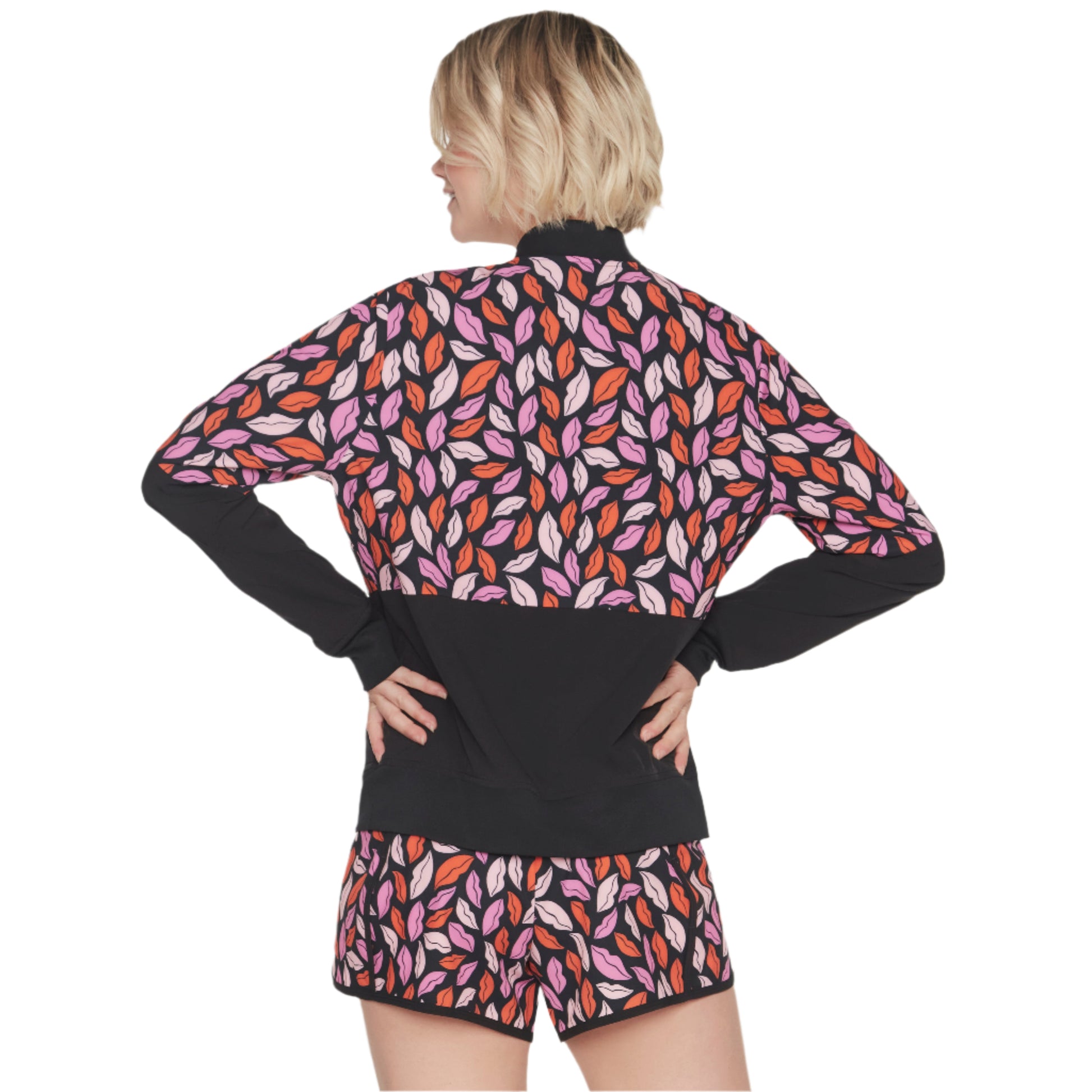 | • 88% Polyester, 12% Spandex • 1x1 rib collar, cuffs, and hem • Diamond logo emergency hair tie zipper puller at center front • Front welt pockets • Skechers® x DVF logo detail • From the Skechers x Diane von Furstenberg collaboration featuring the fashion house's print archives • Full zip reversible bomber jacket |